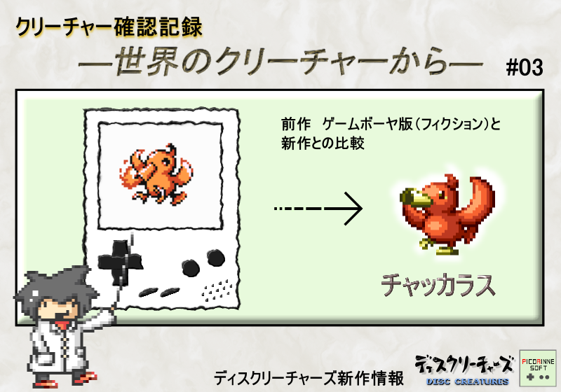 【クリーチャー確認記録 ―世界のクリーチャーから― 】 第三回は、このクリーチャー 火を噴く赤い鳥、「チャッカラス」です。 チャッカラスは「ペカンの森」や「ルクの林」の入り口付近に生息しています。 筒のようなクチバシから火を噴いて相手を攻撃します。 頭の良いクリーチャーで、バトルの時はいきなりマインドがアップして高火力の特技を放つことができます。 そしてチャッカラスといえばディスクリーチャーズをプレイしてくださった方ならご存じ、主人公(あなた)の家にも住んでいるクリーチャーです。 新しいディスクリーチャーズの世界でも、また新たな一面を見せてくれるかもしれません! ------------------------------------------------------------------------------------------------------- さて、今年もいよいよ残りわずかとなりました。 また改めてこのブログで年末の挨拶をさせていただきますが、その時にディスクリーチャーズの新作の情報を少し書けたらと考えています。 あくまで情報はほんの少しかもしれませんので、あまり期待せずにお待ちください 笑 PR CommentsComment Form |