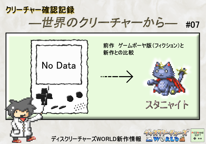【クリーチャー確認記録 ―世界のクリーチャーから― 】 第7回は、前作に登場しなかった新クリーチャー 赤いマントが洒落乙なニャンコ、「スタニャイト」です。 スタニャイトはディスクリーチャーズWORLDで初めて登場するクリーチャーです。 明るい場所が苦手で、普段はあまり人の目に触れない所で生活しているようです。 でも本当はスタニャイトは目立ちたい願望を持っています。 いつか陽の当たる場所で人やクリーチャーの歓声を浴びたいと思いながら今日も暗闇を駆け回るのです。 ディスクリーチャーズWORLDでは未だ見ぬクリーチャーがたくさん登場します。 今回初登場となるクリーチャーの情報はあまり多くは出さない予定ですが(実際にゲーム本編で見つけて頂きたいので!)、これからもこのクリーチャー確認記録をどうぞよろしくお願いします。 ------------------------------------------------------------------------------------------------------- ここから久々の雑記です。 ただ今、ディスクリーチャーズWORLDの傍らでディスクリーチャーズの新しいグッズを制作しています。 現在、通販で取り扱っているキーホルダーよりも手軽なコレクショングッズになります。 近々このブログやツイッターで告知しますのでご興味のある方はチェックしていただけると幸いです! PR CommentsComment Form |