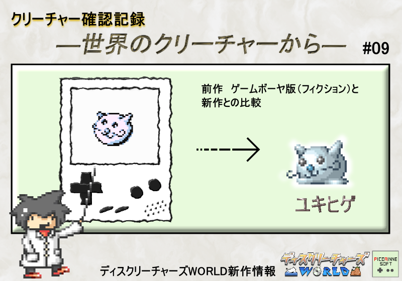【クリーチャー確認記録 ―世界のクリーチャーから― 】 第9回は、このクリーチャー 巻き毛(髭)がチャームポイント、「ユキヒゲ」です。 ユキヒゲは雪の体を持つ、雪山に生息するクリーチャーです。 野生のユキヒゲとは冒険後すぐに出会うことはできませんが、「ルクの村」でディスクを交換して貰うことができます。 「ディスクリーチャーズWORLD」でも早いうちに出会うことができるかもしれません。 ユキヒゲの特徴は、スキルの「だつりょく」です。 このスキルはバトルが始まると自動で敵のパワーを下げることができるスキルで、相手にすると少しやっかいなクリーチャーです。 ●ディスクリーチャーズWORLDで変わるコト 前作「ディスクリーチャーズ」では炎や大地など、11種類の属性が存在していました。 「ディスクリーチャーズWORLD」ではこの属性の数がいくつか少なくなります。 その為、前作にも登場したクリーチャーの一部は属性が変更されているものが存在します。 例えば、ユキヒゲは前作では氷属性のクリーチャーでしたが「ディスクリーチャーズWORLD」では氷属性自体が存在しません。 ですのでユキヒゲは水属性のクリーチャーとなります。 また、前作では属性の相性が複雑だったのでWORLDではバトル中でも敵の属性や弱点などを分かりやすくする予定です。 それではまた次回のクリーチャー紹介でもどうぞよろしくお願いします。 タイトル「大人へのあこがれ」(フィクションです。こんな変化はしません) 落書きコーナーは次回から無くなるかもしれません(どうでもいいことですが・・・!!)落書きより制作進めろと神の声が聞こえました。 ------------------------------------------------------------------------------------------------------- 告知です。 ピコリンネソフトは5月14日に秋葉原UDXで行われる東京インディーフェスに出展できることになりました。 出展タイトルは「INFINOS外伝」です。 詳しくは後日、このブログやツイッターで発表させて頂きますのでどうぞよろしくお願いします。 PR CommentsComment Form |