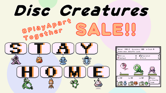 今年もピコリンネソフトをよろしくお願いします。 更新も約1年ぶりとなってしまいましたが、制作は地道に進んでおります。 ・2021年を振り返って 2021年もコロナの影響でイベントがほとんど開催されず、ピコリンネソフトも表立って何かをすることはありませんでしたが、その分ディスクリーチャーズWORLDの制作に集中する1年になりました。一昨年まではSATTOが一人でクリーチャーデザインをしている段階でしたが、昨年頭から別ゲームの作業を終えたRYOが合流し、ようやく2人態勢での制作が開始しました。 全クリーチャーのデザインを終えたことでゲーム自体の制作に着手することができ、4月ごろにはゲーム画面の公開ができるまでになりました。 前作とは大きく変わった画面作り、そして仲間クリーチャーの連れ歩き機能に前作プレイヤーの方から好評をいただくことができました。 そして夏ごろから作業を開始した「クリーチャーのアニメーション」。こちらも連れ歩き同様に期待されていた要素だったようで非常に多くの反応をいただきました。 このアニメーション制作が全クリーチャー分というのも相まって膨大な作業量となっており、殆ど根性論で進めています。大変ではありますが全てのクリーチャーに生命が吹き込まれるようで手ごたえも感じています。 まだ見せられる画面が少なく、続編制作を発表してから時間が経っているものの未だ制作初期段階ではありますが、2021年の1年間で見れば制作速度は段違いに上がっていると思います。 今作は初の2人での制作であるため、作業を割り振りつつ基本的にはスカイプで話しながら進めているため、2人のモチベーションも高く良い制作環境になっていると思います。 ・2022年目標 今年の目標は基本的なシステムを完成させることです。まだシステムができていないため、実際にゲームを遊んでみることもできず、結果としてイベントなどでお披露目することもできません。 今年のイベント開催がどのようになるかはまだわかりませんが、ゲームが試遊できるまでになっていれば下半期で一度お披露目ができればと思っています。年内完成は作業量的にも確実に不可能ですが、試遊できる形にまで持っていければその後の制作もスムーズになると思います。 色々と寄り道をすることになり制作が滞っていたディスクリーチャーズWORLDですが、今は少しずつですが間違いなく前進しています。SATTOのツイッターでは定期的にクリーチャーやゲームの画面を公開していますので、是非こちらもご覧ください。 それでは改めまして、今年もピコリンネソフトをよろしくお願いします。 2020.04.10 Fri 22:53:53 STAY HOMEキャンペーンを実施します新型コロナウイルスの感染への予防として世界中で外出の自粛が推奨されています。